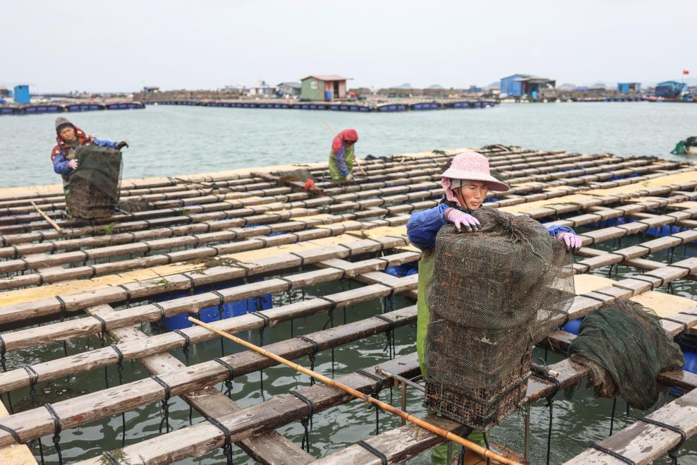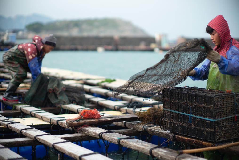 12月4日,福州市连江县奇达村村民在海边处理收获的牡蛎。