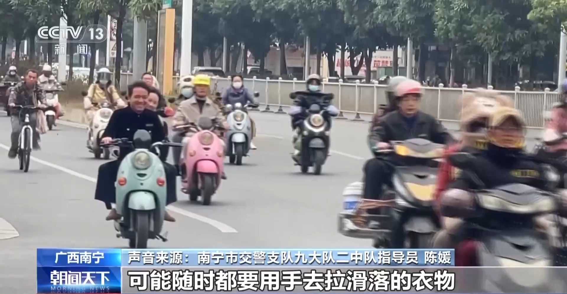南宁市交警支队九大队二中队指导员 陈媛:反穿衣时可能随时都要用手去拉滑落的衣物,也会分散骑手的注意力,导致交通事故发生。