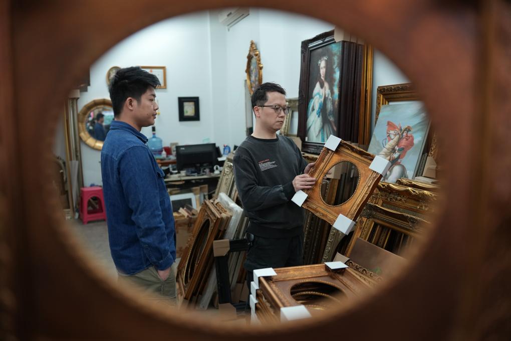 12月13日,陈剑华在深圳市龙岗区大芬油画村一家装裱相框店铺里选画框。