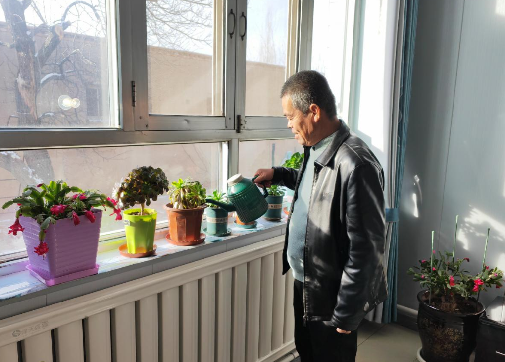宁夏灵武市崇兴镇中北村村民马金保今冬最爱干的一件事就是在家里养花。“以前冬天屋里冷,花不好养,现在每个房间都热乎,我养了20多盆!看着心情就好。”他拿着水壶一边给花浇水一边说。