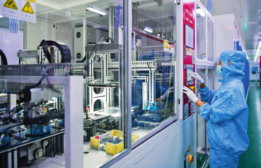 工作人员在位于陕西西安的隆基单晶硅太阳能电池工厂内调试设备(资料照片) 张博文摄/本刊