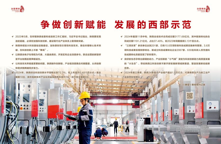 陕西迅速落实习近平总书记的重要指示,省委十四届四次全会审议通过《关于深入实施创新驱动发展战略加快建设科技强省的决定》。加快深化科技体制机制改革,修订《陕西省科学技术进步条例》,接续推出《陕西省培育千亿级光子产业创新集群行动计划》《秦创原创新驱动平台建设三年行动计划(2024—2026年)》《关于全面深化科技成果转化“三项改革”的若干措施》等政策文件,继续全力建设西安综合性国家科学中心和具有全国影响力的科技创新中心,出台西安区域科创中心建设的系列支持政策……以一系列举措促进创新链产业链资金链人才链深度融合,加速培育和发展新质生产力,努力在加强科技创新、建设现代化产业体系上取得新突破。