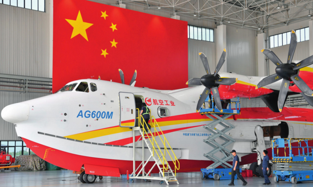 在陕西蒲城国家民机试飞基地的机库内,机务人员对AG600飞机进行检查(2024年7月17日摄) 邵瑞摄/本刊