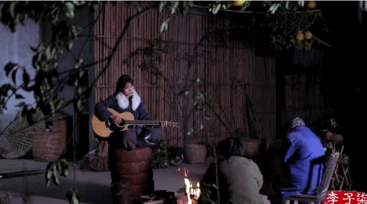 盘坐在火堆前弹琴唱歌