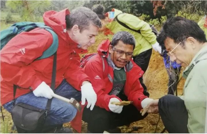 7月1日清晨,小雨淅淅沥沥,云雾中的帽天山朦胧缥缈,侯先光叫上雇请的农民工,一起向帽天山进发。他们没有走之前的线路,而是另辟蹊径,选择了山麓西坡。与此前一样,挥镐的同伴剥土挖石,挥锤的侯先光劈石找标本,两人持续工作了6个小时。