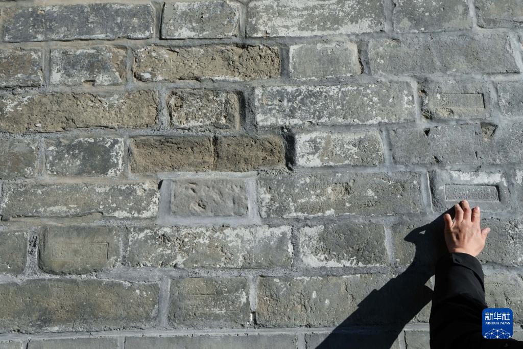 12月26日,参观者在正阳门箭楼下参观城砖上的铭文。 新华社记者 鞠焕宗 摄