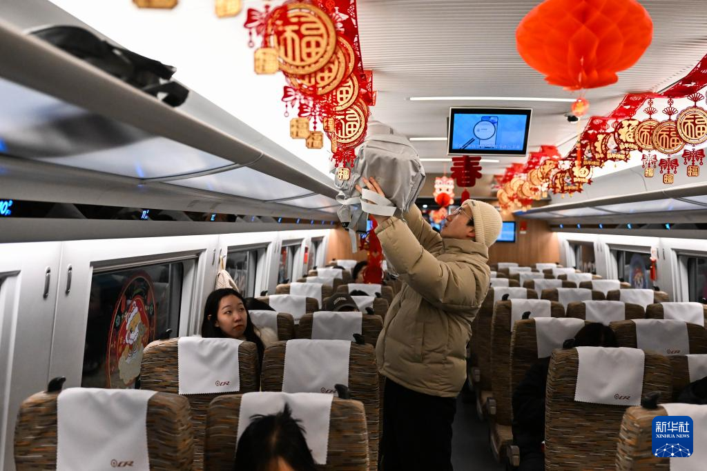 12月31日,一位乘客在呼和浩特东站开往太原南站的G4798次列车上摆放行李。 新华社记者 李志鹏 摄