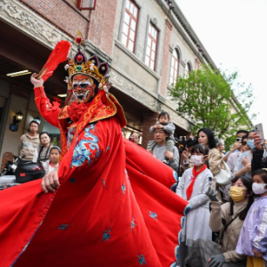 在泉州中山路,游客观看变脸表演。新华社记者 周义 摄
