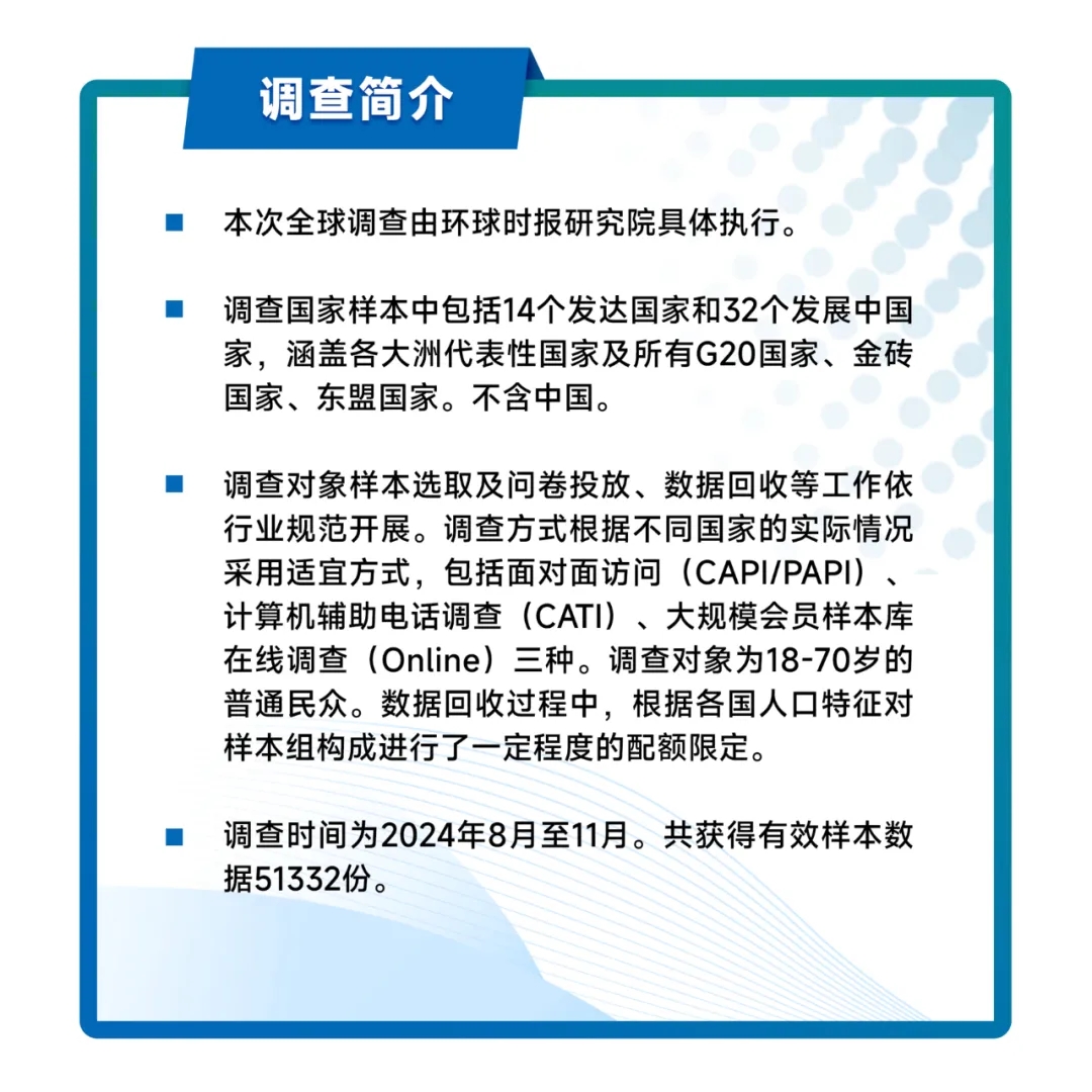 当前,世界百年变局加速演进。中国对世界的影响,从未像今天这样全面、深刻、长远;世界对中国的关注,也从未像今天这样广泛、深切、聚焦。世界如何感受中国变化?怎样看待中国发展?如何认知中国形象?为此,环球时报社启动了一项面向46个国家、5.1万名民众的问卷调查,这也是新中国成立以来,国内开展的规模最大、样本量最多、问卷设计最全面深入的全球民意调查。