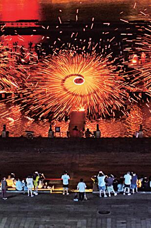 湖南长沙铜官窑国风乐园内,游客在观看“打铁花”表演。新华社发