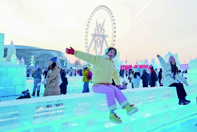 游客在黑龙江哈尔滨冰雪大世界园区内拍照。新华社发