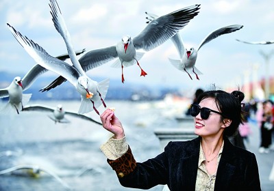云南昆明,一名游客在海埂大坝投喂红嘴鸥。新华社发