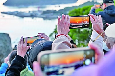 在福建霞浦县三沙镇花竹村日出观景点,游客在拍摄海上日出。新华社发