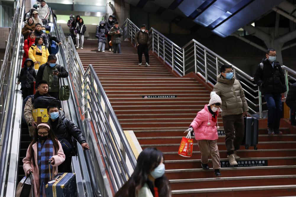 2024年1月26日,在北京西站,乘坐G511次列车返回湖北老家的钱克怡(右三)与爸爸牵手准备乘车。当日,2024年春运启动。