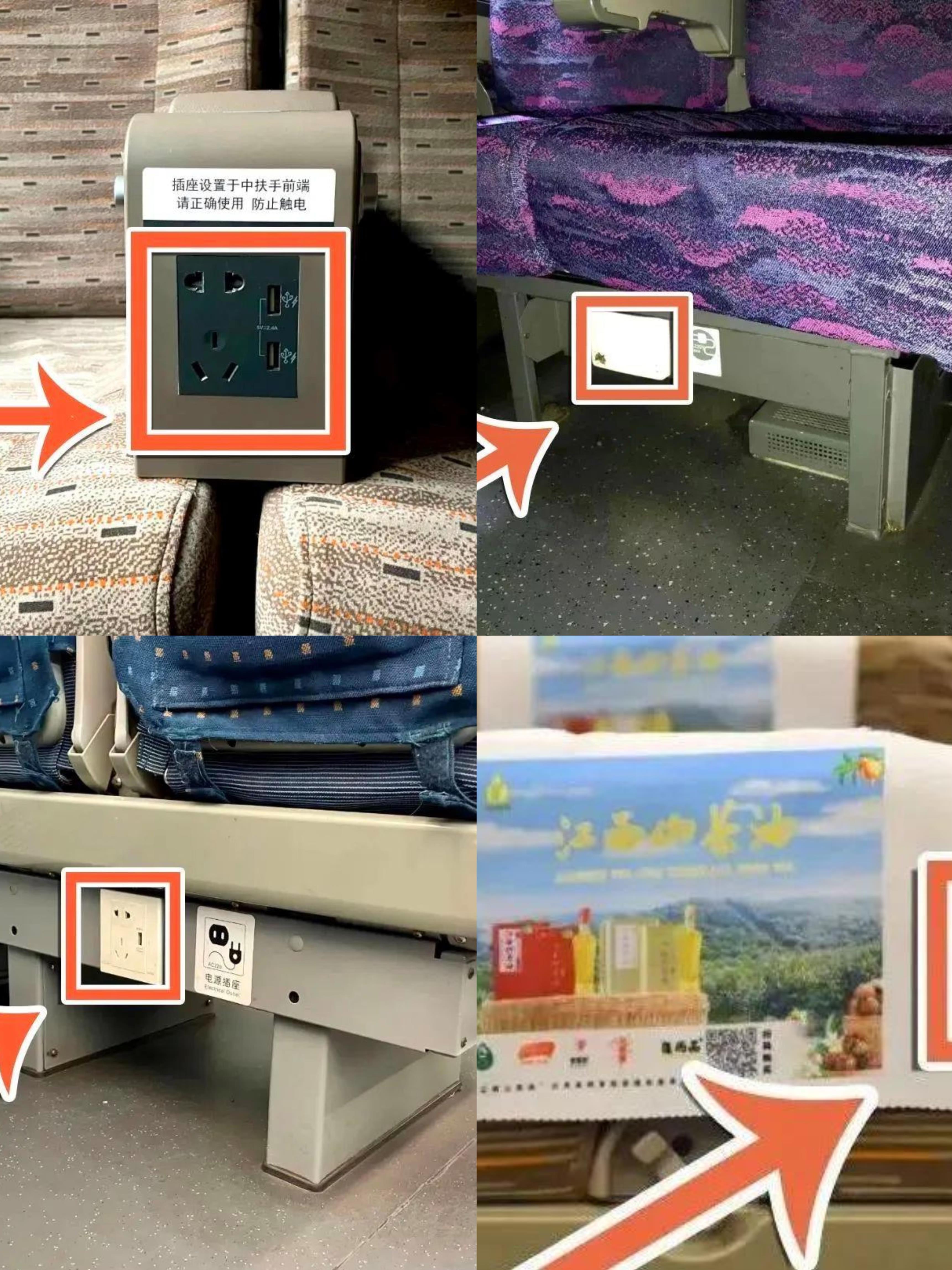 △由于车型、座席差异,动车组列车的充电位置也有差别,比如座椅扶手中间、两个座椅中间下方位置、座椅靠背后方、前方座椅靠背下方。