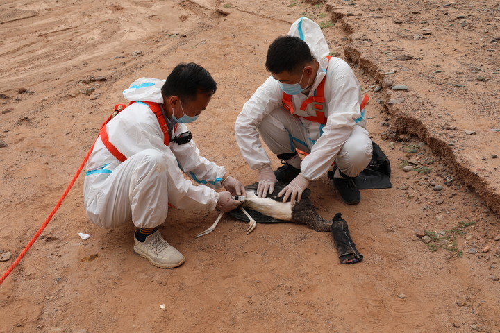 在甘肃张掖黑河湿地国家级自然保护区,单国锋(左)和同事为一只黑鹳戴上监测设备(资料照片)。新华社发(甘肃张掖黑河湿地国家级自然保护区管理局供图)