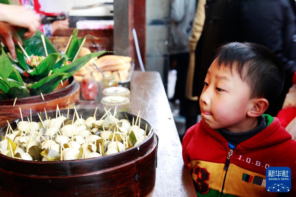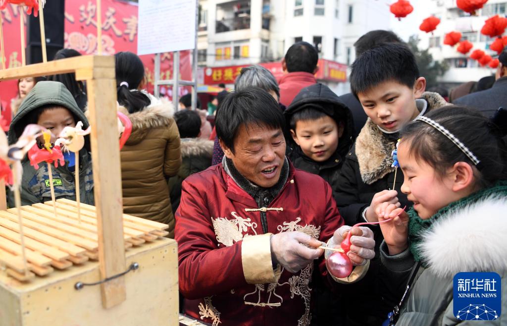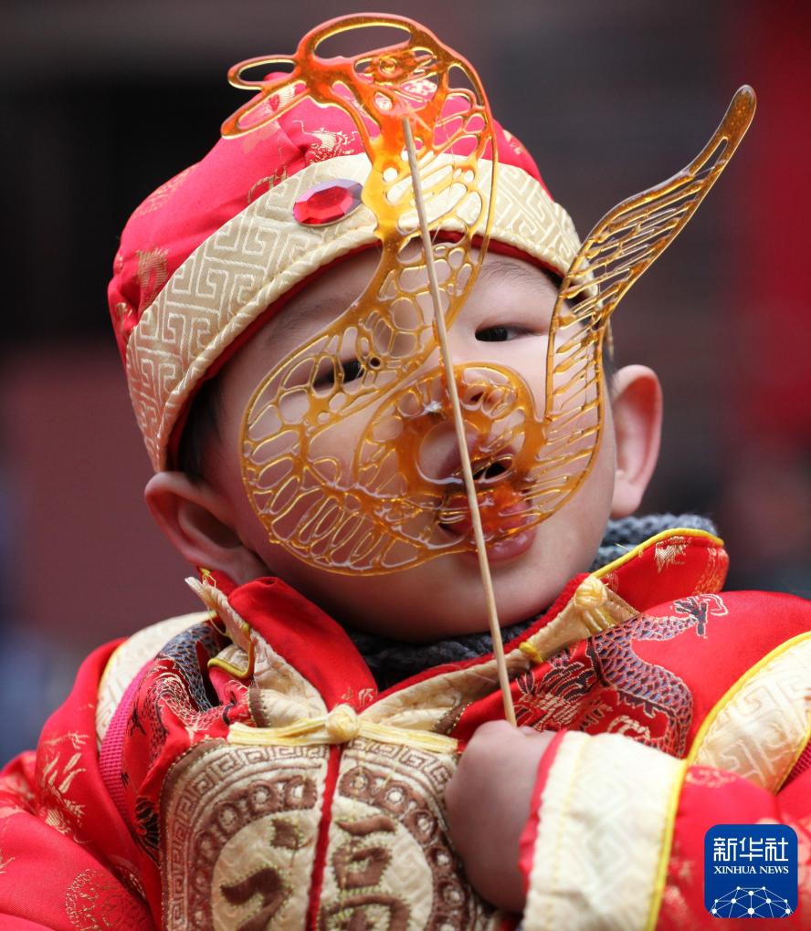 2018年2月2日,一名小朋友在安徽合肥锦绣社区举办的春节文化庙会上体验吹糖人。新华社记者 刘军喜 摄