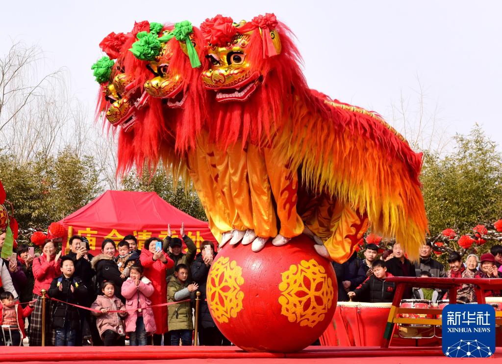 2019年2月16日,游客在河南开封翰园文化庙会上观看舞狮表演。新华社记者 朱祥 摄