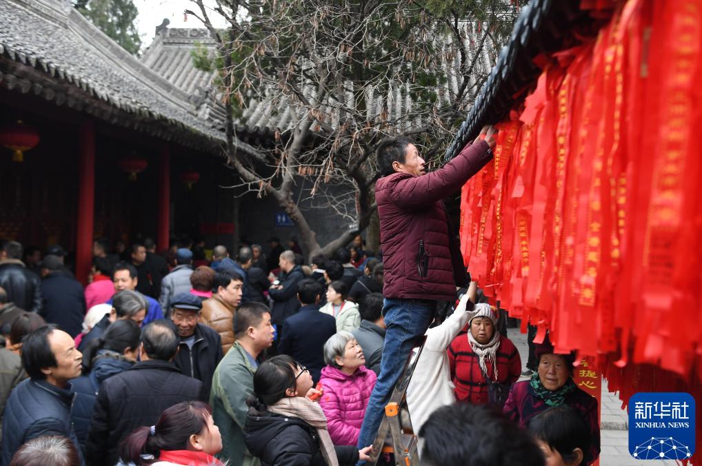 2019年2月28日,游客在陕西蓝田水陆庵古庙会上挂祈福条。新华社记者 刘潇 摄