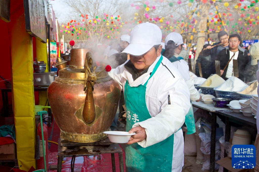 2014年2月2日,北京厂甸庙会的工作人员用大茶壶冲制老北京茶汤。新华社发(赵冰 摄)