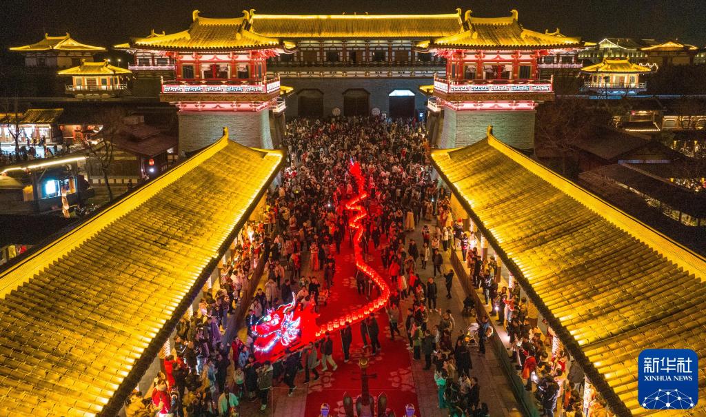 2024年2月12日,游客在湖北襄阳唐城景区观看板凳龙灯巡游表演。新华社发(杨东 摄)