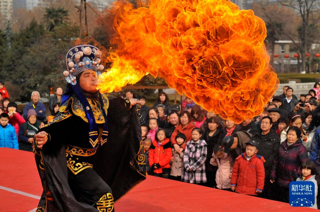 2012年2月1日,市民在陕西西安小雁塔庙会上欣赏艺人的“吐火表演”。新华社记者 刘潇 摄