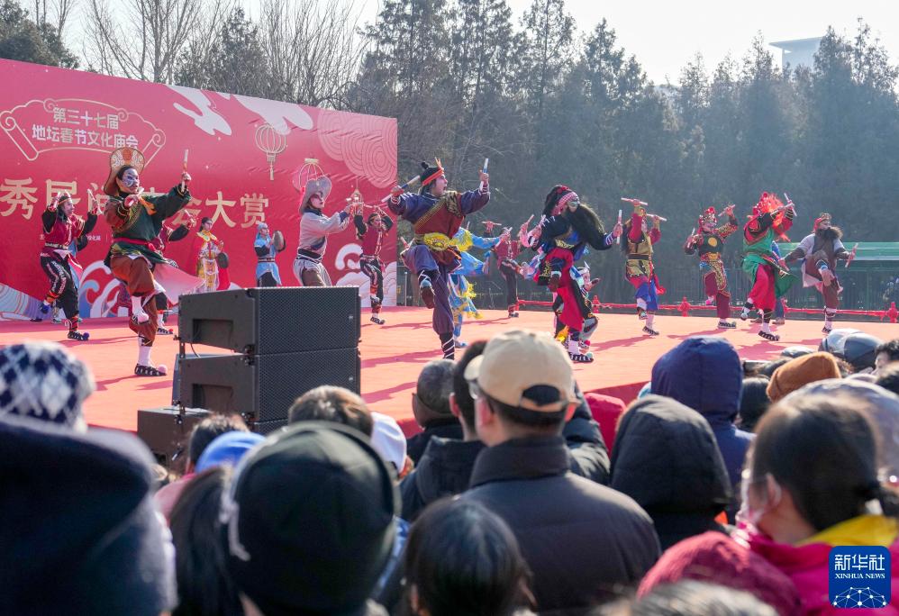2025年1月29日,游客在北京地坛庙会上观赏来自广东普宁嘉美英歌队的表演。新华社记者 鞠焕宗 摄