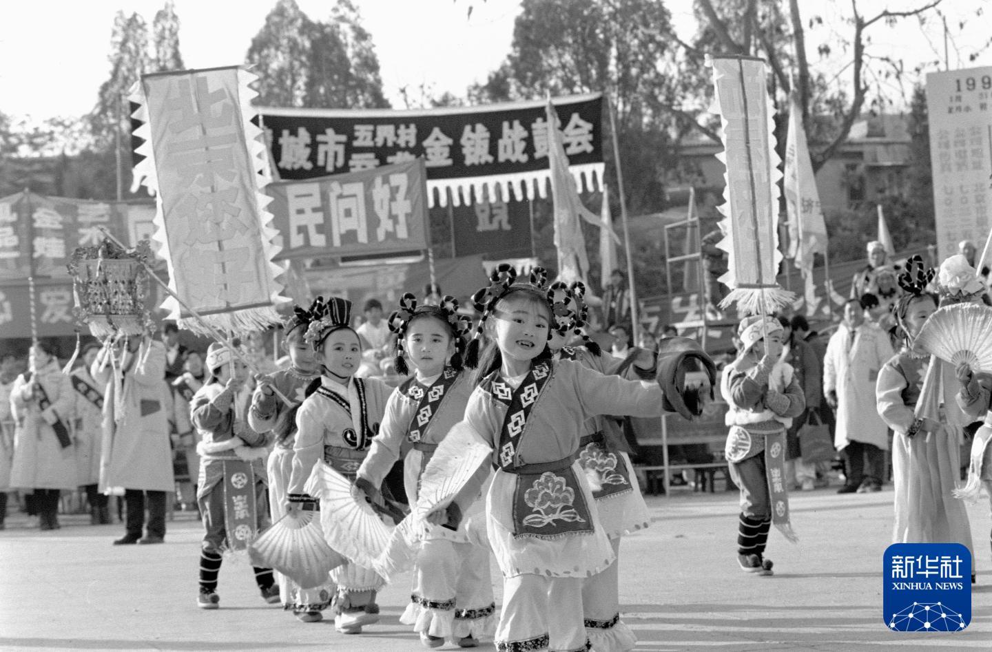 1995年,来自山东招远的儿童在北京龙潭庙会上表演“海洋秧歌”。新华社记者 王呈选 摄