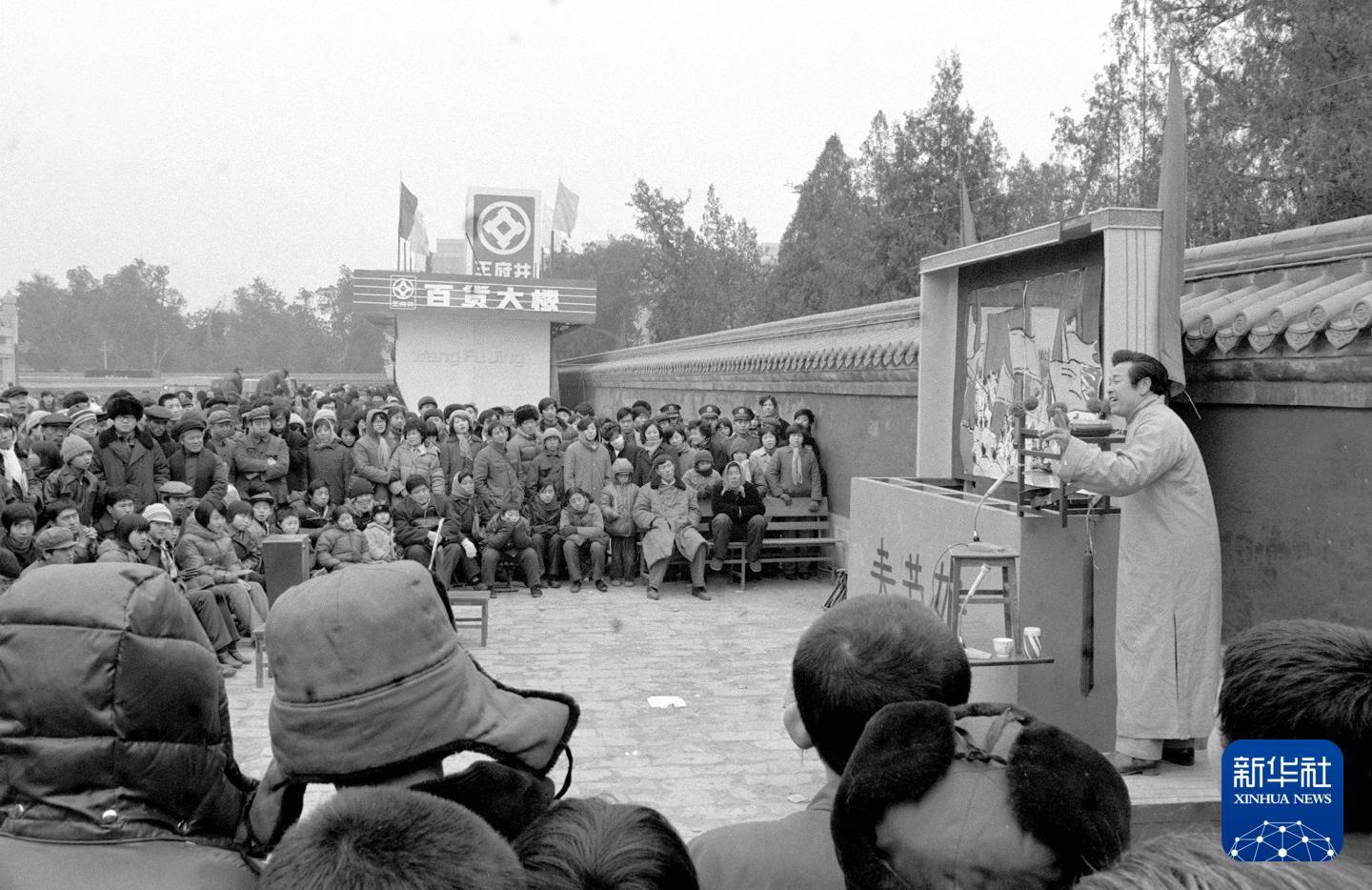 1985年,一位手艺人在北京地坛庙会上表演“拉洋片”。新华社记者 李基禄 摄