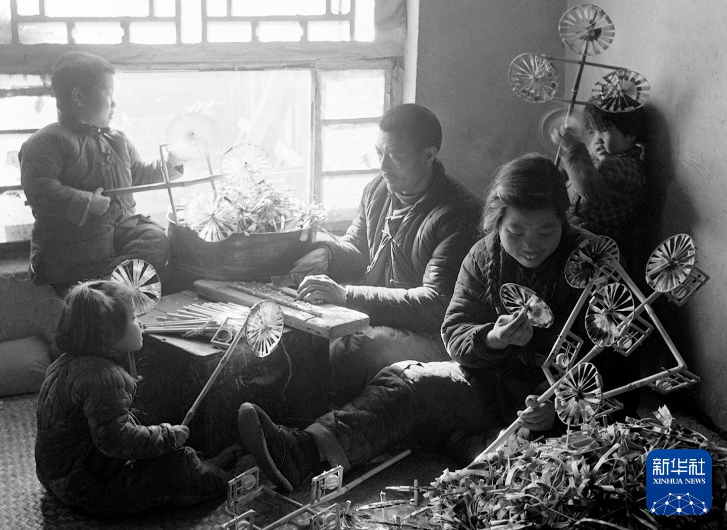 1959年,纸工张德寿和他的家人赶制风车,准备到北京厂甸庙会上出售。新华社记者 纳一 摄