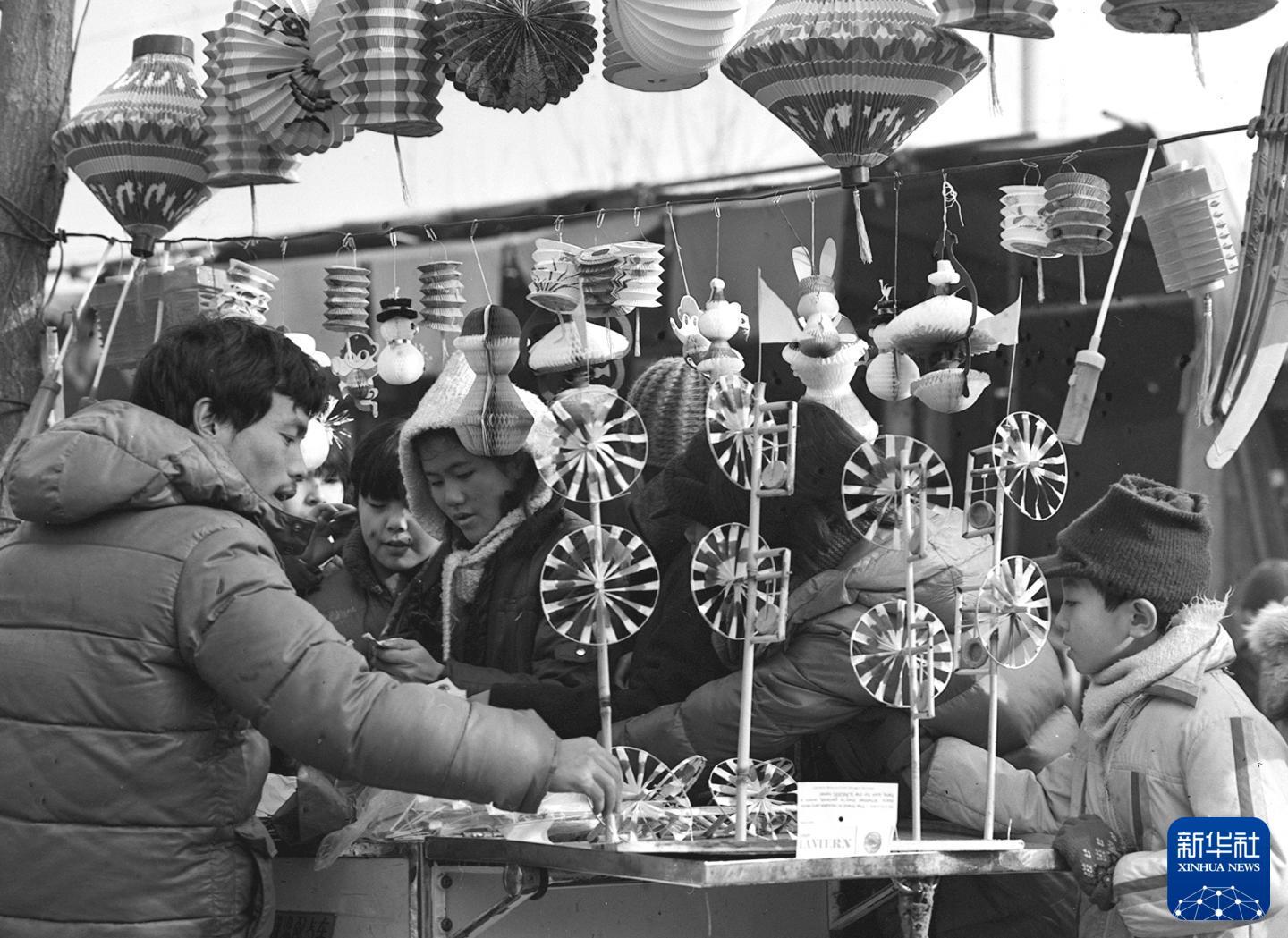 1987年,人们在北京大观园庙会上,选购花灯、风车等手工制品。新华社记者 郑书福 摄