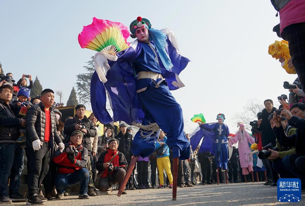 2017年2月12日,演员在河南浚县古庙会上表演高跷。新华社记者 李安 摄