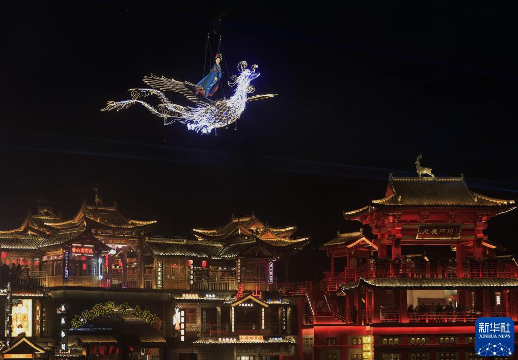 2025年1月17日,演员在河北唐山河头老街新春游园活动上为游客表演“凤凰飞天”。新华社记者 杨世尧 摄