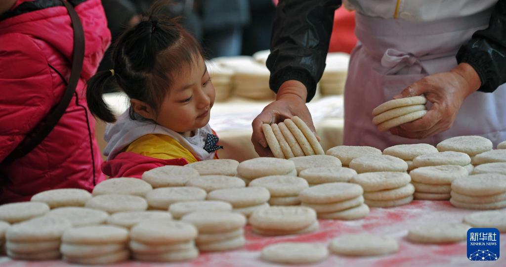 2014年2月3日,湖南长沙火宫殿春节庙会上,一名女孩正在看工作人员摆放制作好的糍粑。新华社记者 李尕 摄