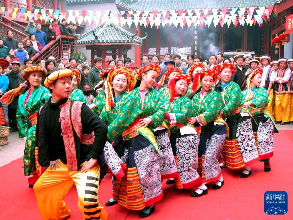 2003年2月5日,在湖南长沙举办的花瑶迎春庙会上,人们在表演民族风情舞蹈。新华社发