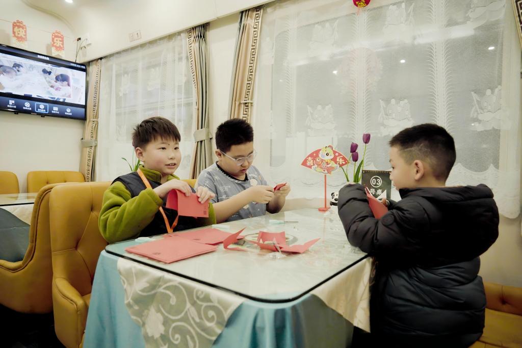 1月31日,在成都至西昌的蛇年新春首趟非遗文化主题“熊猫专列”上,小朋友们正在体验剪纸。新华社记者 李力可 摄