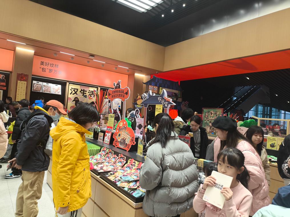 在湖南省博物院,“湘当有味的马王堆”展吸引来自全国各地的游客。在博物院四楼的“博物馆公园”中,不少游客排队选购各类文物元素的文创产品、体验拓印、写春联等活动。