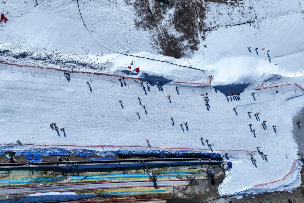 游客在天湖滑雪场体验滑雪