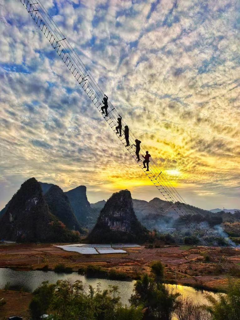 “桂林的玩法不止一种,加点勇气,你能感受到运动与山水融合的魅力。”在桂林阳朔金宝河畔的岩邦户外营地,天梯飞拉达项目负责人刘永邦正忙着给游客讲解注意事项并加油打气。这个春节,不少来阳朔过节的游客尝试体验飞拉达。