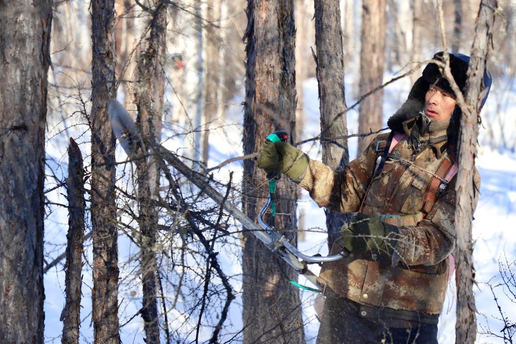 天刚蒙蒙亮,一场大雪过后,漠河林场森林抚育队伍在齐腰的积雪中向山里进发。每年冬天,林场数十名职工都会组成森林抚育队伍,前往人迹罕至的林区作业点进行营林工作,修剪病腐木、清理倒木。