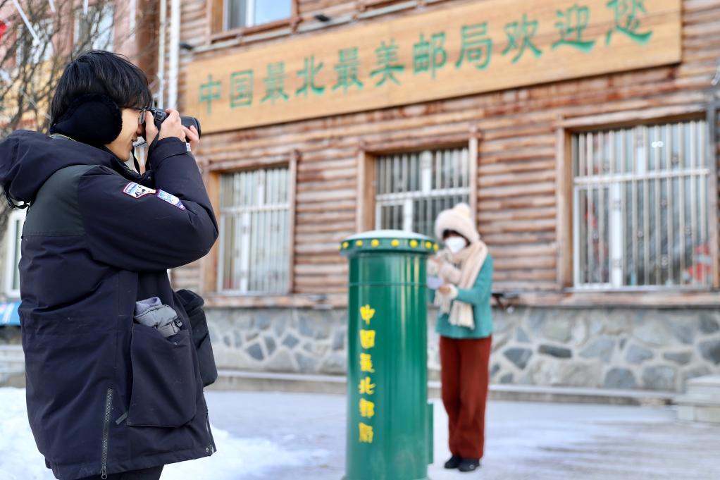游客在“中国最北邮局”前拍照留念。新华社记者 徐凯鑫 摄