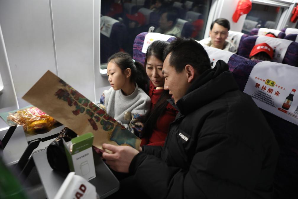 颉华(右)一家三口在返岗专列上浏览青岛市地图。新华社记者张睿 摄