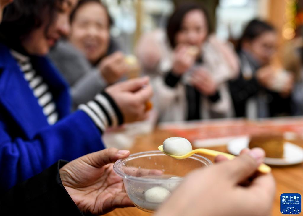 2019年2月19日,在新疆乌鲁木齐大巴扎步行街,市民和游客品尝元宵。新华社记者 王菲 摄