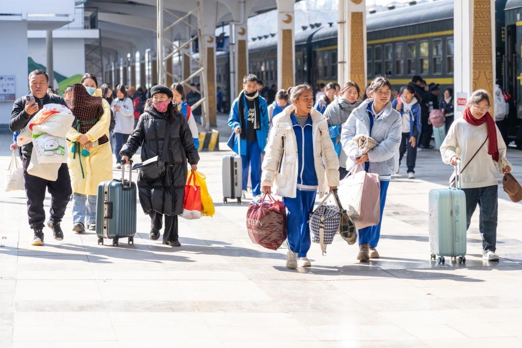2月13日,学生们带着行李准备踏上5633次慢火车前往学校。新华社发(范东海摄)