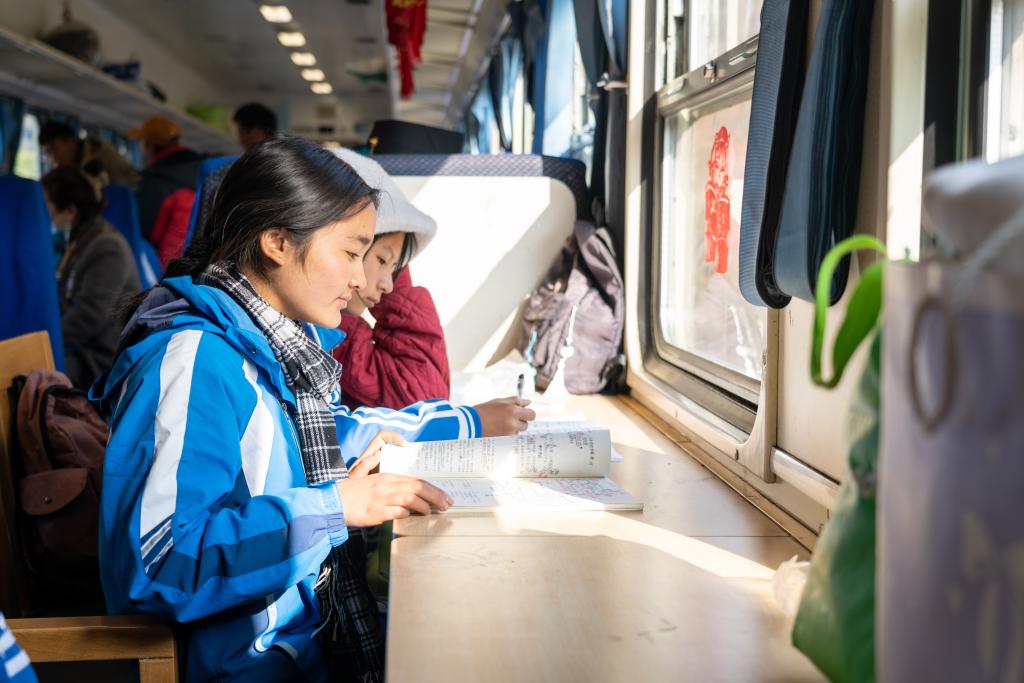 2月13日,学生们在慢火车“学习车厢”写作业。新华社发(范东海摄)