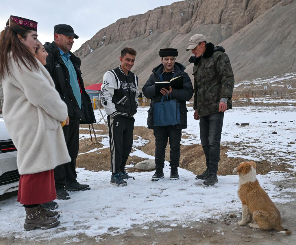 在新疆喀什地区塔什库尔干塔吉克自治县瓦恰乡夏布孜喀拉村,多来提曼·开米克(右二)在村里走访时与年轻村民交流(2025年1月3日摄)。
