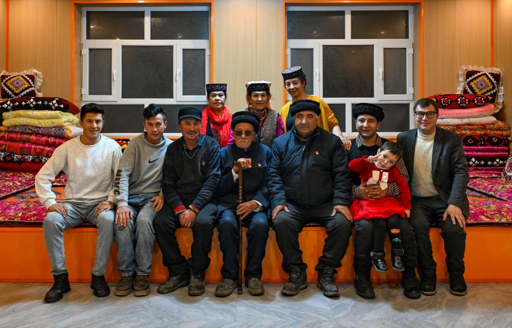 在新疆喀什地区塔什库尔干塔吉克自治县瓦恰乡夏布孜喀拉村,多来提曼·开米克(右二)在牧家乐经营主帕尔吾尼克·吾地那(右一)家中调研,听取他对乡村旅游发展的意见建议(2025年1月3日摄)。