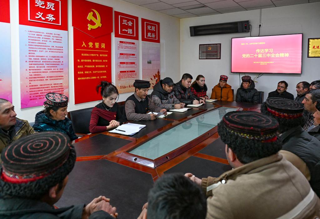 多来提曼·开米克在新疆喀什地区塔什库尔干塔吉克自治县瓦恰乡夏拉夫迭村宣讲党的二十届三中全会精神(2025年1月4日摄)。