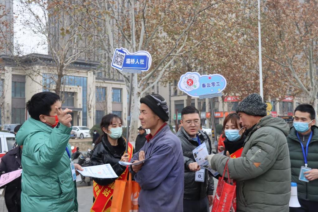 灞桥区零工驿站工作人员在马路市场上做政策宣传。(受访者供图)