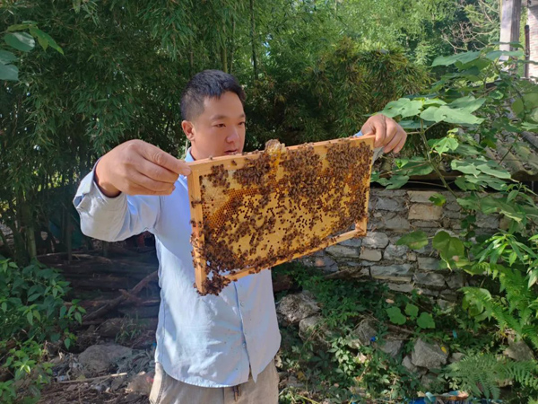 “不向困难低头!不能被击垮!”一个偶然机会,张顺勇在赶集时看见有人卖当地的“土蜂蜜”,而且价格也不低,便萌发了养蜂的念头。说干就干,张顺勇再次创业,踏上了养蜂之路。手划破了、脸晒黑了、被蜂蛰了,甚至不小心摔下山坡导致左小腿粉碎性骨折,但他毅然坚定地往前走。